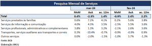 O setor de serviços expandiu +0,4% em março, resultado consistente com uma contração interanual de -2,3%. O resultado foi um pouco melhor do que o esperado pelo mercado (+0,2% e -2,5%, respectivamente), mas, ainda assim, reduziu o crescimento acumulado nos últimos 12 meses para +1,4%.