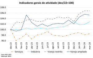 Em conclusão, a bateria de dados do 1º trimestre de 2024 sugere retomada da atividade frente ao observado no final do ano passado, particularmente marcante nas vendas no varejo (gráfico 2). O aparente descasamento entre os indicadores mais ligados à oferta (indústria e serviços) e os ligados à demanda (vendas no varejo, restrito e ampliado) é um tema a ser observado adiante, sendo mais um fator a, potencialmente, complicar a vida da autoridade monetária. A bateria de dados de março manteve a nossa projeção de crescimento interanual do PIB no 1º trimestre em +2,3%; as questões relevantes se colocarão a partir de maio, com os efeitos da tragédia climática no Rio Grande do Sul e seus impactos sobre a economia em 2024.