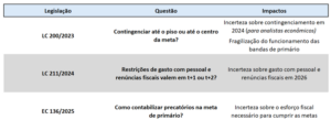 No pacote de medidas fiscais do fim de 2024, foi aprovada uma nova regra fiscal, que agora desperta importantes divergências interpretativas entre Executivo, Legislativo e Tribunal de Contas da União (TCU). A LC 211/2024 impôs que, a partir de 2025, haverá vedações orçamentárias no exercício subsequente à apuração de um déficit primário. Até que seja observado superávit anual, não se pode aprovar concessões, ampliações ou prorrogações de renúncias de receita, e o crescimento real das despesas com pessoal será limitado a 0,6%a.a.. No entanto, no Projeto de Lei de Diretrizes Orçamentárias de 2026 (PLDO 2026), o governo dispõe que as restrições não se aplicam ao Orçamento do ano que vem. Na interpretação do Executivo, o exercício “subsequente à apuração” seria 2027, uma vez que o primário de 2025 somente é apurado em janeiro de 2026.