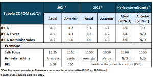 Em termos objetivos, a revisão do cenário oficial foi alinhada ao que esperávamos. Em nossa avaliação dos modelos oficiais, exposta no Destaque BRCG, enxergávamos uma projeção de inflação para o 2º trimestre de 2024 entre 3,3% e 3,4%, o que é consistente com os números reportados pelo Comitê para o início de 2026 (3,5%). A mudança na sistemática de apresentação dos resultados é uma bem-vinda evolução da comunicação, com tabela que expõe as aberturas das projeções, entre preços livres e administrados, com premissas e resultados para o horizonte analisado.