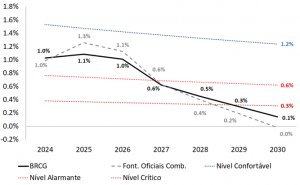 [18] Despesa discricionária do Informativo Conjunto do PLDO (2025-2028) e do RPF 2023.2 (2029-2030) menos a projeção de despesas discricionárias rígidas do RPF. As estimativas do RPF foram feitas antes da revisão de premissas e das metas fiscais do PLDO 2025. Como isso pode afetar a projeção da dinâmica da despesa rígida, principalmente no curto prazo, o cálculo serve mais como um teste de robustez para a estimativa proprietária da BRCG, sobre a qual a análise será construída.