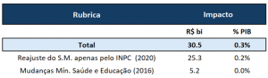 É importante frisar que não se está, necessariamente, a criticar as mudanças feitas em vinculações e indexações. Esse não é o objetivo desse relatório. Entretanto, é necessário deixar claro que essas mudanças têm implicações relevantes e pouco discutidas, provocando um agravamento da dinâmica dos gastos públicos no médio prazo, sem que o governo tenha apresentado possíveis formas de compensar esses efeitos.