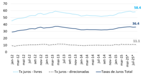 Com a elevação da taxa Selic, as taxas de juros cobradas nas novas operações de crédito a pessoas físicas (PF)[2] começaram a aumentar, em especial a partir de janeiro de 2025. A taxa média passou de 32,3% a.a. em setembro de 2024 para 36,8% a.a. em junho de 2025, mantendo-se em patamar similar nos meses seguintes (gráfico 2). Essa elevação foi mais intensa nas taxas de operações com recursos livres, que aumentaram 6,10 p.p. até agosto, enquanto as taxas de operações com recursos direcionados – crédito rural, financiamento imobiliário e crédito junto ao BNDES – cresceram “somente” 1,20 p.p.[3]