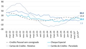 [7] A implementação da Resolução Conselho Monetário Nacional (CMN) 4.966, de 2021, e Resolução BCB 352, de 2023, que definiu novos conceitos e critérios contábeis para a constituição de provisão para perdas esperadas e a baixa a prejuízo, levou a um aumento na estatística da taxa de inadimplência a partir de janeiro de 2025. Contudo, houve uma elevação efetiva da taxa de inadimplência a partir do início do ano por outros fatores que não deve ser minimizada, conforme demonstra estudo do próprio Banco Central apresentado no Box do Relatório de Política Monetária de setembro de 2025. https://bcb.gov.br/publicacoes/rpm
