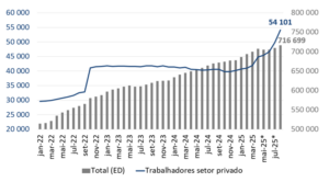 Uma exceção à desaceleração do crescimento das carteiras de crédito é o consignado a trabalhadores do setor privado. Identificado como um potencial canal de redução do custo de crédito a pessoas físicas, expandiu 34,7% nos primeiros oito meses de 2025 na comparação com igual período de 2024. Esse desempenho refletiu a edição da Medida Provisória 1292/2025, que ampliou o acesso e facilitou as condições de obtenção de garantias para a captação dessa modalidade de crédito (gráfico 8). Tendo em conta que a implementação de etapas previstas na legislação ainda está em processo, a perspectiva é que o volume dessa carteira cresça substancialmente ao longo dos próximos trimestres. Note-se, entretanto, que o seu desempenho tem frustrado as expectativas nos últimos meses; para que o saldo dessa nova linha atinja montante equivalente ao do crédito consignado aos beneficiários do INSS, será necessário um crescimento adicional da ordem de 400%.