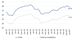 Na reunião de setembro de 2024, o Comitê de Política Monetária (COPOM) iniciou um ciclo de elevação da taxa básica de juros, contraindo progressivamente a política monetária. Até junho de 2025, a taxa Selic foi elevada em 4,5 p.p, atingindo 15,0% a.a. O aumento da restrição monetária fica evidente, também, no comportamento da taxa de juros real ex ante de 1 ano[1] elevando-se de 7,5% a.a. em setembro de 2024 até aproximadamente 9,5% a.a. no terceiro trimestre de 2025 (gráfico 1).