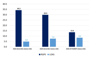 Gráfico 1: Diferença das despesas de RGPS e LOAS entre execução orçamentária e Orçamento anual (R$ bilhões)