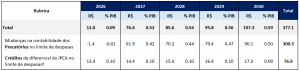Estimativas próprias indicam que o texto atual da PEC 66/23 geraria R$377bi a mais de espaço para gastos sob o limite de despesas até o fim da década (tabela 1). Para que se tenha ordem de grandeza, o orçamento estimado para o abono salarial entre 2026 e 2030 é da ordem de R$200bi[7], e o pacote de ajuste fiscal do governo, divulgado no fim do ano passado, geraria abertura de espaço para despesas da ordem de R$300bi[8] entre 2026 e 2030. Trata-se, portanto, de uma grande e perene redução do esforço fiscal, pelo lado das despesas, necessário para cumprir os limites estabelecidos em lei.