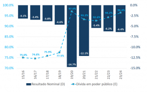 Gráfico 1: Resultado nominal e dívida em poder do público (% do PIB, 2015/2016 a 2023/2024)