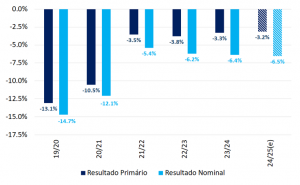 Uma análise dos fluxos fiscais se faz necessária. Primeiro, serão apresentados os resultados fiscais (nominal e primário) do ano fiscal corrente (2024/2025), destacando as principais mudanças ocorridas nas receitas e nas despesas. Avaliações prospectivas serão feitas posteriormente.