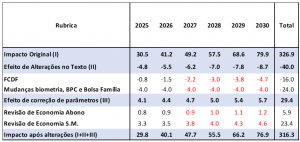 As alterações reduziram em 12% o impacto fiscal projetado até 2030, de acordo com as estimativas oficiais. A projeção inicial do Ministério da Fazenda previa uma economia de R$ 327bi até o fim da década. Contudo, a remoção das mudanças no FCDF, as alterações nos critérios de elegibilidade de benefícios assistenciais e as exceções às exigências de biometria resultaram em uma redução de R$ 40bi no impacto projetado. No entanto, a revisão dos parâmetros após a divulgação do PIB (corrigido) de 2023 ajustou novamente as estimativas, resultando em o impacto esperado apenas R$ 11bi abaixo da previsão inicial (tabela 1).