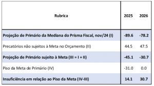 Mesmo com os ajustes nos textos finais, e reconhecendo as incertezas inerentes às projeções, entendemos que o pacote fiscal deve facilitar o cumprimento do piso da meta fiscal até o fim do governo. Em novembro, antes da aprovação do PL 4614/24 e da EC 135/24, a mediana das projeções do Prisma Fiscal indicava déficits primários de R$ 89bi em 2025 e R$ 78bi em 2026. Descontando despesas com precatórios atípicos não sujeitos à meta fiscal previstas no LDO 2025 e na PLOA 2025, as projeções apontam déficits de R$ 45bi em 2025 e R$ 31bi em 2026. Assim, o mercado projetava insuficiência em relação ao piso da meta da ordem de R$ 14bi em 2025 (piso com déficit de R$ 31bi) e de R$ 31bi em 2026 (piso em resultado fiscal neutro). Se a economia estimada for de R$ 30bi em 2025 e de R$ 40bi em 2026, como sustenta o governo, o pacote fiscal abrirá espaço orçamentário para cobrir o gap projetado em relação ao piso da meta fiscal (tabela 2).