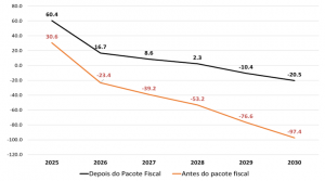 [5] Em 2026, o pacote fiscal já não conseguiria atender ao cumprimento do piso da meta fiscal, exigindo um esforço fiscal hoje estimado em R$ 31bi. De acordo com a avaliação das discricionárias livres, ainda haveria uma folga de R$ 17bi em relação ao patamar operacional mínimo. Seria necessário, portanto, esforço arrecadatório da ordem de R$ 14bi em 2026, tal como explicitado anteriormente no texto.