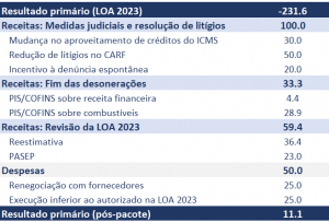 Sempre expressamos nosso desconforto quanto à estratégia que o governo escolheria para acomodar novos dispêndios: parecia-nos claro que seria através de um aumento da arrecadação, e não de uma reformatação dos gastos orçamentários. O pacote do início de 2023 acabou com qualquer dúvida. O pagamento da fatura, ao menos no curto prazo, ocorrerá principalmente com o aumento de receitas, a partir de renegociações, medidas judiciais, resolução de litígios tributários e fim das desonerações. Além disso, o ajuste das receitas foi ampliado por revisão dos parâmetros macroeconômicos de referência e pela utilização dos recursos não sacados do PIS/PASEP[3]. A redução das despesas fica em segundo plano, como se pode observar na tabela abaixo.