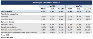 Bottom line: A produção industrial permaneceu estável em janeiro, com aceleração da transformação e recuo da extrativa. Com um mundo em ebulição e um cenário doméstico delicado, seguiremos com grande volatilidade e sem uma clara tendência definida.