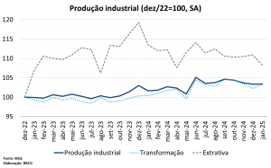 Em nível, ajustado sazonalmente, a indústria está de lado desde meados de 2024 (gráfico 1), ainda que a extrativa tenha registrado uma tendência levemente declinante. É importante entender, nos próximos meses, como o cenário vai se desenvolver. Em princípio, são boas as razões para acreditarmos em uma desaceleração da transformação ao longo do ano, em paralelo a alguma retomada da extrativa. A incerteza, no entanto, é bastante elevada, e muitos fatores, externos e internos, precisam ser computados.