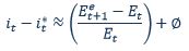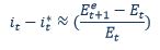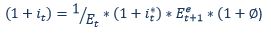 Notem, no entanto, que a moeda doméstica não é igual à moeda estrangeira, ou seja, o investimento no exterior precisa ser convertido, em termos da moeda doméstica, pela taxa de câmbio (1/Et). Portanto, no período seguinte, a rentabilidade do investimento no exterior, convertida à divisa nacional, será de , onde o último termo é a expectativa de depreciação da moeda nacional durante um período.