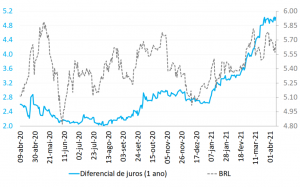 Gráfico 1: Diferencial de juros de 1 ano vs. taxa de câmbio nominal (BRL/USD)