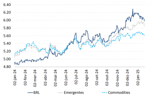 Depois da forte depreciação observada no ano passado, temos observado certa descompressão do cenário cambial nas primeiras semanas de 2025. Há tanto fatores globais como locais em operação, no que parece ser uma “acomodação” dos excessos ocorridos ao final de 2024.