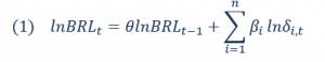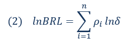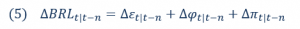 onde  são fatores globais,  é o diferencial de juros e é a componente local (residual) da variação da moeda entre dois momentos, t e t-n. Note-se, o período de avaliação da decomposição importa: janelas diferentes terão distintas variações dos fundamentos, levarão a pesos (elasticidades) diferentes, e, portanto, a contribuições diferentes.