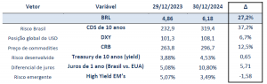 Começando a análise pelo comportamento da taxa de câmbio durante o ano passado, a tabela 1 elenca o comportamento da moeda e dos fundamentos utilizados nos modelos (tanto do BRL como do risco-país) dentre o final de 2023 e o final de 2024 (em ambos os casos, contabilizando no último dia útil).