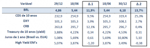 De uma ponta à outra, o BRL enfraqueceu 27,2%. Nesse período, foi possível observar um aumento do risco Brasil (+37,2%, ou 87 pontos-base), um fortalecimento global do dólar americano (+6,7%) e um aumento dos juros longos americanos (+65 pontos-base). Todos esses fatores operaram para enfraquecer a nossa divisa. Em contrapartida, os preços de commodities aumentaram (+12,5%) e o diferencial de juros entre a economia doméstica e a estrangeira quase dobrou (+5,71 p.p.), fatores a operar para o fortalecimento do BRL. Note-se que o aumento do risco-país ocorreu em ambiente de elevação dos juros longos internacionais (65 pontos-base) e de forte redução do risco emergente (-158 pontos-base).