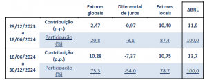 É interessante recordar, dos modelos de pareamento, que o “prêmio doméstico” inverteu de sinal durante o ano, sendo de positivo para neutro até meados de 2024 e, depois, claramente negativo na segunda metade do ano. Isso posto, vamos dividir a análise expressa na tabela 2 em dois momentos distintos, recuperando a decomposição feita em relatório publicado em meados de 2024[16]. A tabela 3 divide o ano em dois, com uma análise das variáveis relevantes entre 29 de dezembro de 2023 e 18 de junho de 2024 (tal como anteriormente publicado) e outra entre 18 de junho e 30 de dezembro.