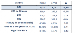 [18] Imediatamente após a posse de Donald Trump, a ausência de medidas concretas na seara comercial levou a uma descompressão importante do risco no mundo, nisso incluindo uma generalizada apreciação das moedas emergentes. É improvável, no entanto, que todas as ameaças feitas durante e depois das eleições tenham sido em vão, sendo mais provável que medidas sejam apresentadas no decorrer de janeiro e fevereiro. Mudanças bruscas de direção no cenário e exacerbada volatilidade devem dar o tom, ao menos no início de 2025.