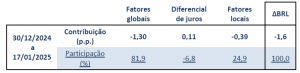 Na tabela 5, apresentamos o comportamento das variáveis entre 30 de dezembro de 2024 e 17 de janeiro de 2025, último dia utilizado em nossas simulações. Optamos por encerrar a análise imediatamente antes da posse de Donald Trump nos EUA (20 de janeiro de 2025), por entender que o início do termo do novo presidente americano pode trazer exacerbada volatilidade aos dados[18]. Uma análise recorrente da dinâmica cambial será lançada, em breve, pela BRCG.