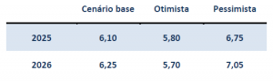 Tabela 7: Cenários simulados para a taxa de câmbio (2025 e 2026, cenários alternativos)
