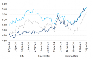 De uma ponta à outra (ou seja, do final de 2023 até 18 de junho de 2024), o BRL enfraqueceu 11,9%. Nesse período, foi possível observar um aumento do risco Brasil (22 pontos-base), um fortalecimento global do dólar americano (3,9%) e um aumento dos juros longos americanos (0,34 pontos percentuais). Todos esses fatores corroboram o enfraquecimento observado em nossa divisa. Note-se, no entanto, que os preços de commodities aumentaram (12,1%) e que o diferencial de juros entre a economia doméstica e a estrangeira ampliou no mesmo período (0,61 pontos percentuais), sendo fatores a operar para o fortalecimento do BRL. É importante notar, também, que o aumento do risco-país ocorreu em ambiente de elevação dos juros longos internacionais e de redução da métrica de risco emergente (12,2 pontos-base).