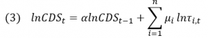 onde  é um vetor de fundamentos globais que afetam a nossa métrica de risco (tendo, dentre as variáveis utilizadas, métricas para o risco global e para o risco em países emergentes). A transformação de (3) em um somatório infinito, tal como feito de (1) para (2), é trivial. O resíduo dessas regressões pode ser entendido como a componente verdadeiramente idiossincrática (ou seja, local) do risco-país.