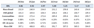 A tabela 1 compara a evolução da cotação da moeda com o desempenho dos principais fundamentos utilizados na decomposição. As janelas utilizadas possuem aproximadamente quatro semanas úteis de extensão, começando no último dia útil de 2023.