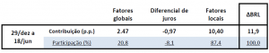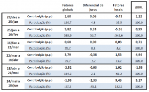 E, em terceiro lugar, os fatores domésticos passaram a operar na direção do enfraquecimento da moeda (na tabela, contribuições com sinal positivo) desde meados de fevereiro, seja reforçando movimentos de depreciação (entre fevereiro e abril), suavizando um fortalecimento da moeda que seria sugerido pelos outros vetores (entre abril e maio) e, mais recentemente, sendo o principal fator a explicar o enfraquecimento da moeda (entre maio e junho).