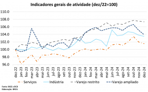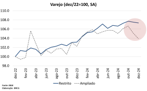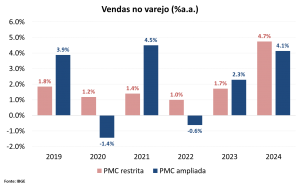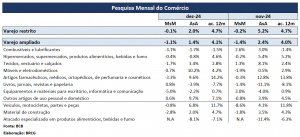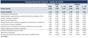 Das aberturas dos indicadores (tabela 1) emergiram sinais particularmente frágeis em categorias específicas, tais como “combustíveis e lubrificantes”, “vestuário e calçados”, “artigos farmacêuticos”, “materiais de escritório” e “material de construção civil”. Em paralelo, desempenhos mais fracos das vendas em “supermercados e hipermercados” e “no atacado” reforçaram um ambiente de fraqueza da demanda ao final de 2024.