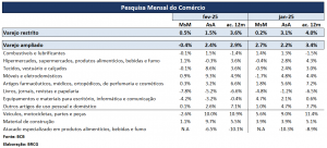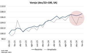 Tal como ocorrido em janeiro, as vendas no varejo trouxeram sinais mistos em fevereiro, trazendo expansão marginal na métrica restrita e contração na métrica ampliada. É seguro dizer que o início de 2025 tem dinâmica de crescimento bem mais suave do que a observada no ano passado, mas, ao menos no momento, os sinais de desaceleração do crescimento da economia são moderados. Resta saber como a economia brasileira vai se comportar na confluência de pressões externas e internas, que estarão refletidas nos dados a partir do final do 1º trimestre.