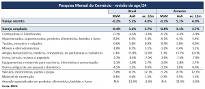 Das aberturas do varejo ampliado (tabela 1), sugere-se que o desempenho marginal positivo foi bastante concentrado, destacando os avanços de combustíveis, “outros artigos de uso pessoal”, automóveis e, em menor intensidade, materiais de construção. Importante segmentos, como vestuário e eletrodomésticos, seguem em contração. Note-se, também, que a revisão das séries históricas muda a interpretação dos dados durante o trimestre. Se olharmos para agosto (tabela 2), a contração marginal do varejo ampliado se mostrou menor no agregado, ainda que sem marcantes diferenças nas suas entranhas.