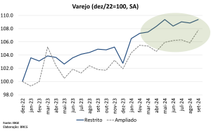 Bottom line: As vendas no varejo avançaram em setembro, especialmente no indicador ampliado, mesmo que abaixo do esperado pelo mercado. Revisões nas séries históricas, no entanto, tornam a comparação com as projeções do mercado mais difíceis. Seguimos esperando um crescimento do PIB em torno de 3,0% em 2024.